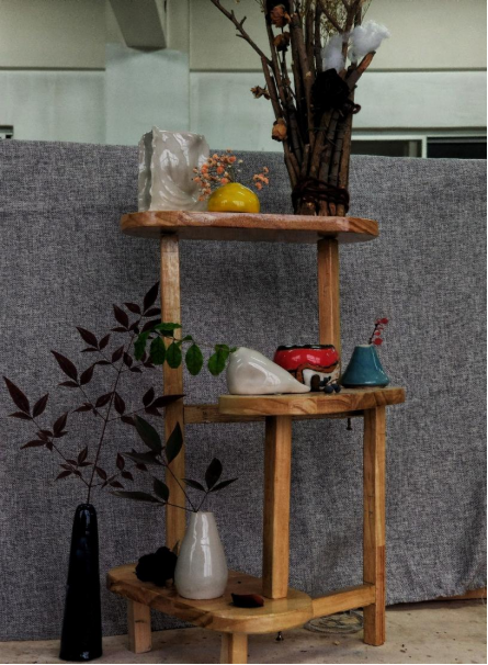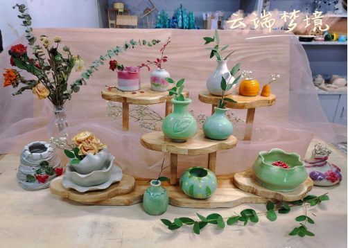 《云端梦境》:作品是一组花瓶组合,立意自然通透,回归本真。作品的样式多用自然的花瓣形及叶形为造型特点,颜色也都选用自然和谐的诸如合欢红及芽绿等通透不突兀的颜色,展架整体选用云朵形状,意在突出和表现花瓶的轻盈精致,质地及色泽,营造自然通透的氛围感。