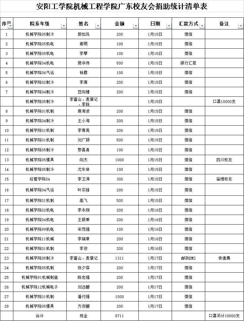病毒无情,人间有爱。新冠肺炎疫情发生以来,广大员工一直心系母校,并用实际行动积极支持母校的疫情防控工作。1月15日广东员工会会长原伟德国际bevictor194905级制冷专业李富山等人从网络上看到关于安阳疫情报道的新闻,第一时间对公司表达了慰问,了解到当前安阳防疫物资紧缺的情况,马上组织相关人员进行防疫物资捐赠筹划。经过精心筹备募捐,截止17日,共筹集了53319支口罩的经费,现在捐赠的口罩已经通过快递邮寄公司员工办。